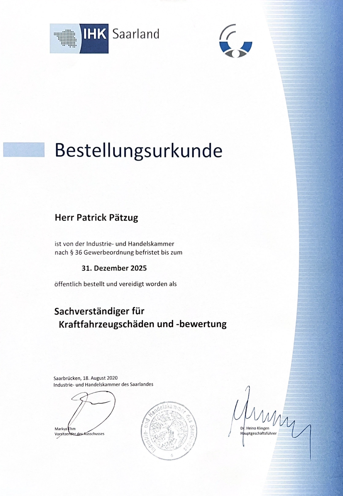 - Öffentlich bestellter und vereidigter Sachverständiger für Kraftfahrzeugschäden und -bewertungen der IHK Saarland
